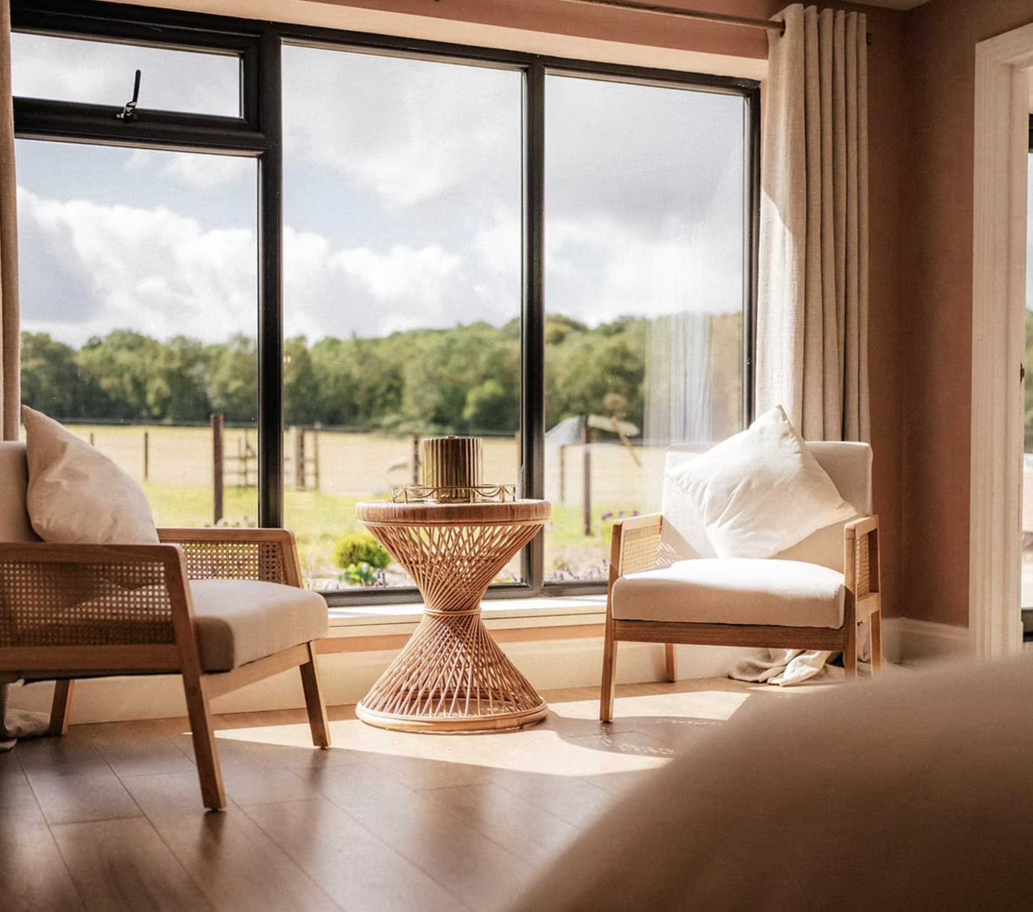 With floor-to-ceiling windows overlooking the gardens, the space is filled with natural light and a welcoming atmosphere.