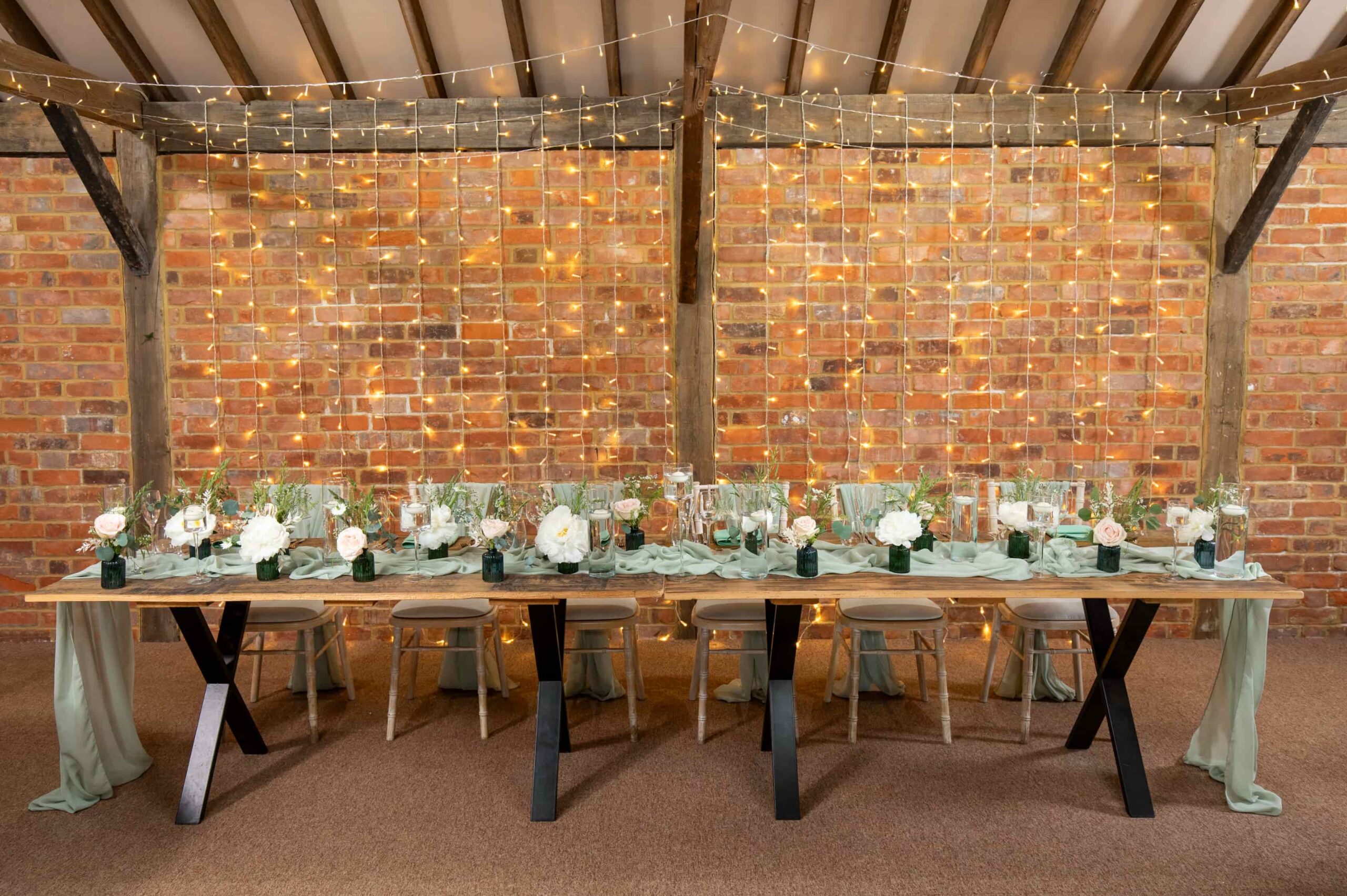 The Lower Barn is where your wedding breakfast will take place. With gorgeous exposed beams and fairy lights, the space provides a relaxed and intimate space for dining with your guests.