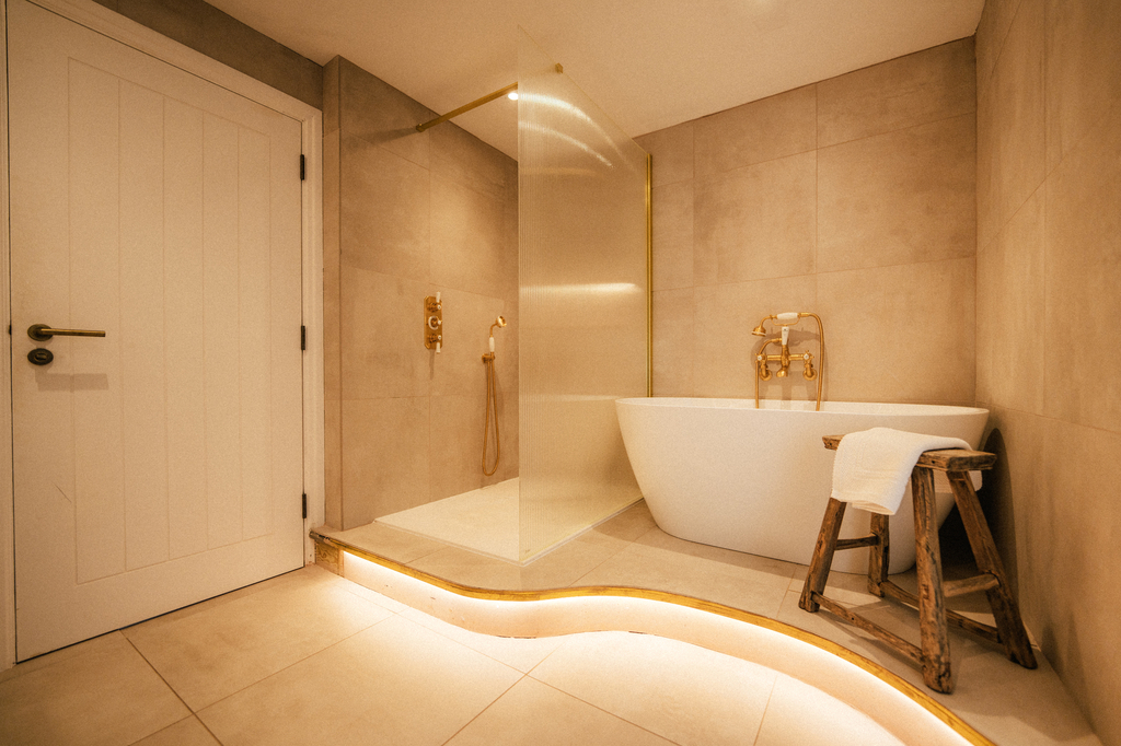 A stylish modern space, carefully designed for comfort, the suite features a luxurious bed, elegant furnishings and a private en-suite bathroom featuring premium shower and bath facilities, creating a calm and serene retreat after a full day of celebration.